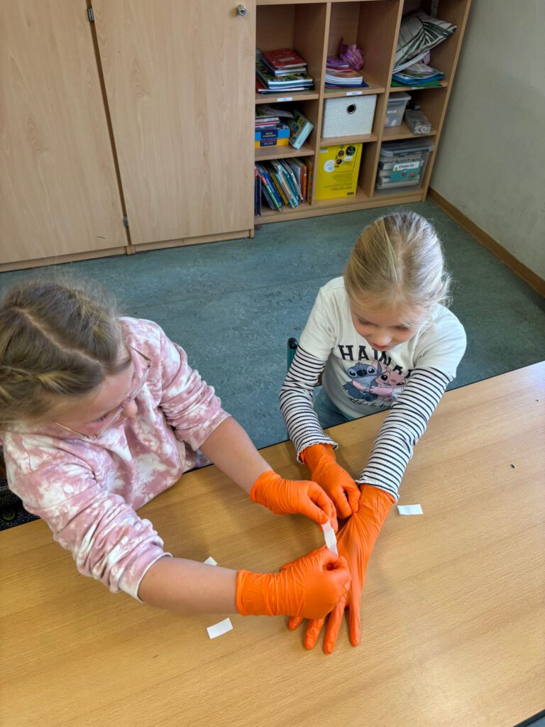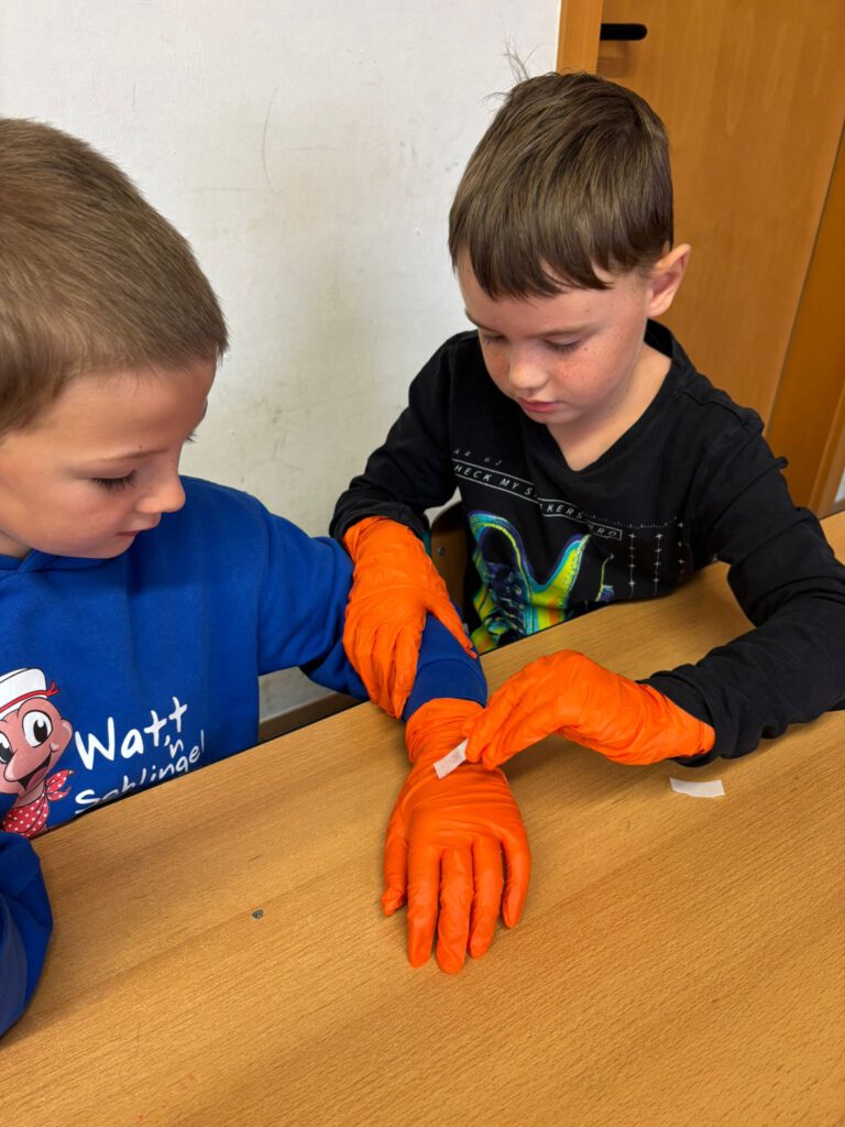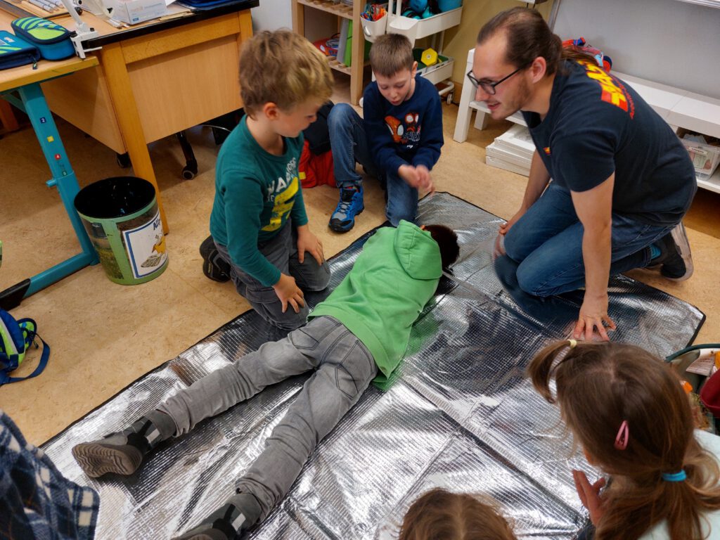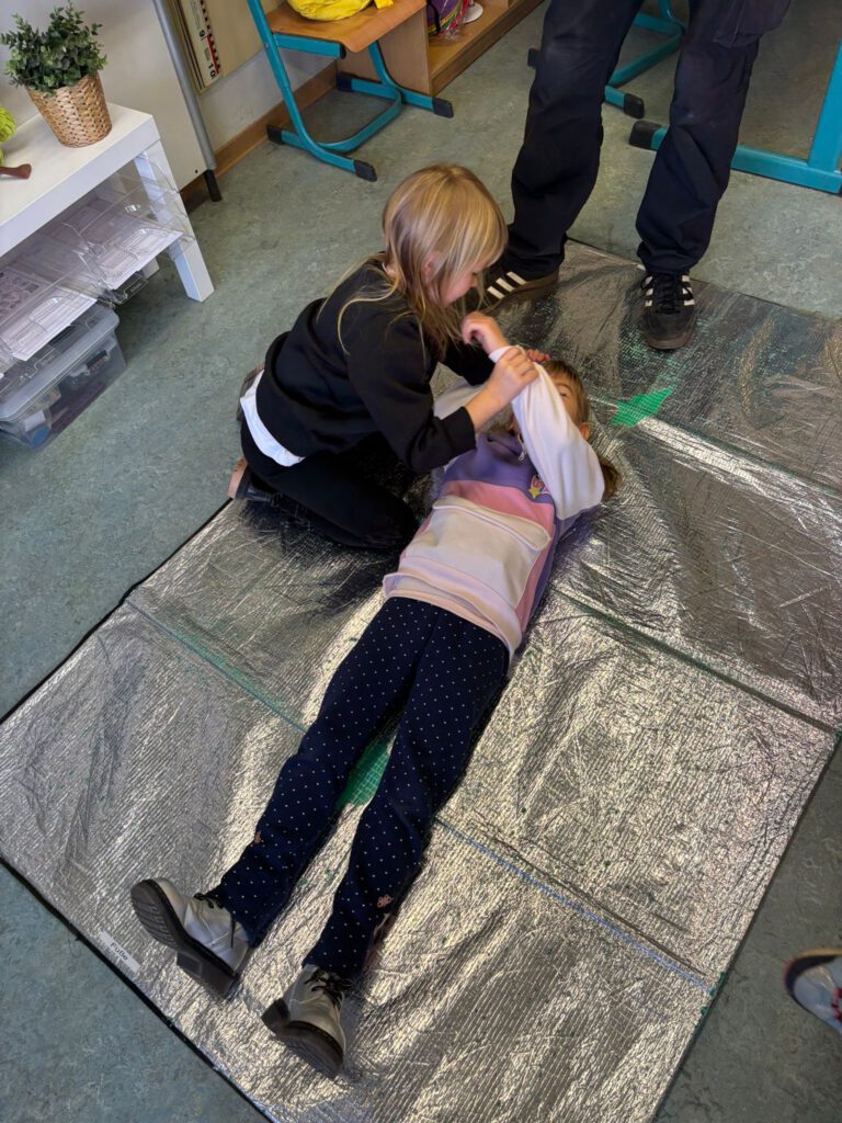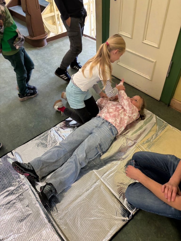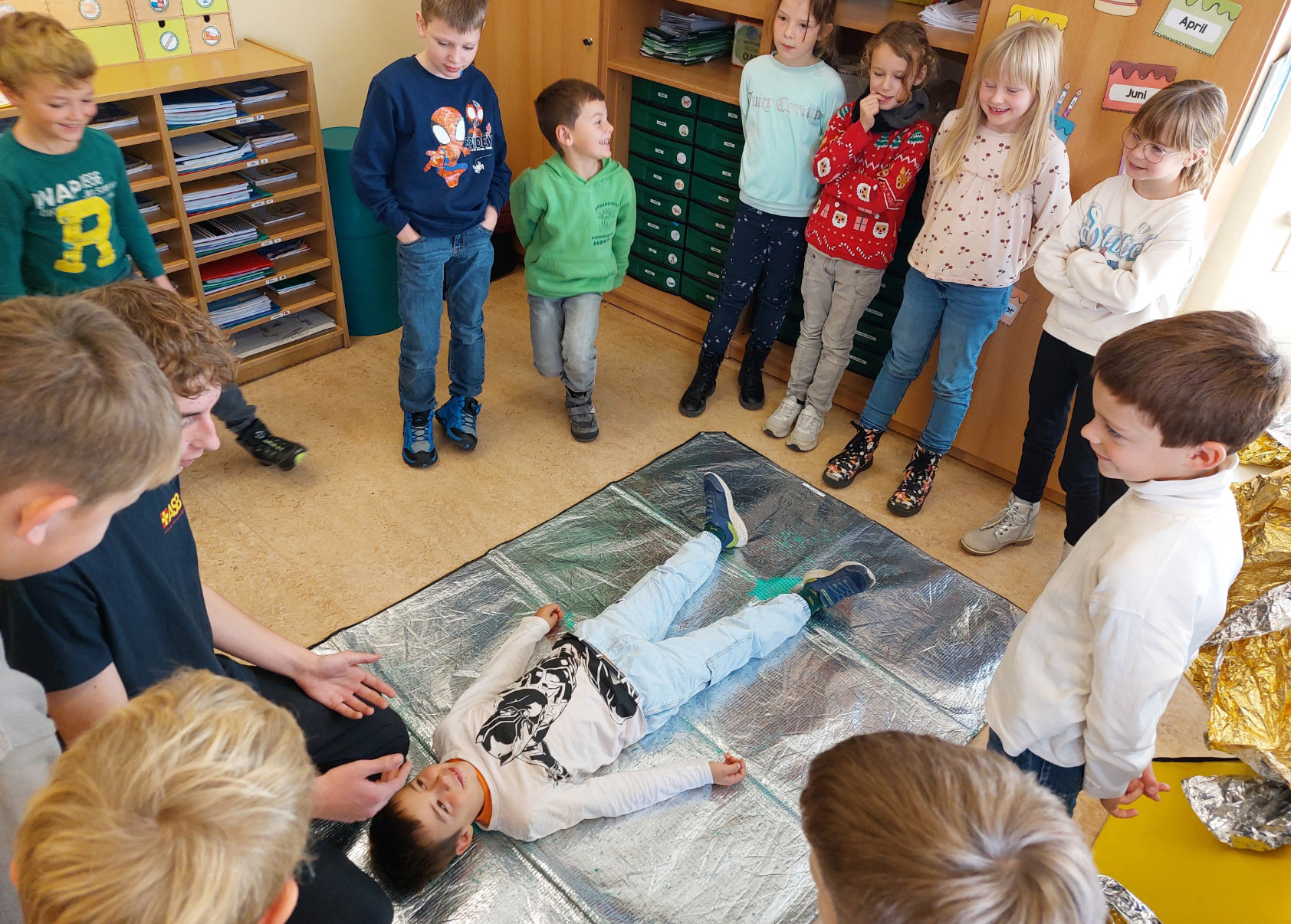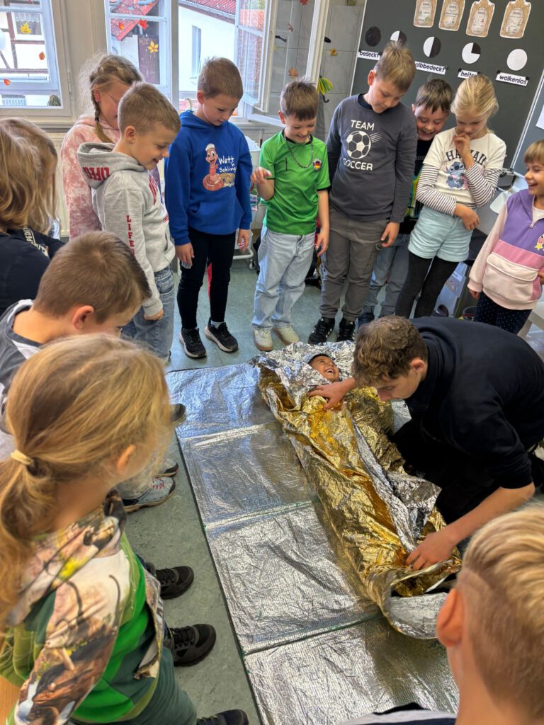 Anschließend durften die Kinder selbst aktiv werden: Sie übten das richtige Anlegen eines Pflasters, wobei sie darauf achteten, das sterile Polster nicht zu berühren. Zum Abschluss wurde die stabile Seitenlage geübt – natürlich mit viel Spaß und unter Anleitung der Fachleute. Auch das Zudecken mit einer Rettungsdecke durfte nicht fehlen.
