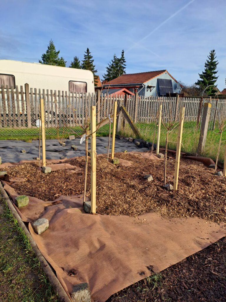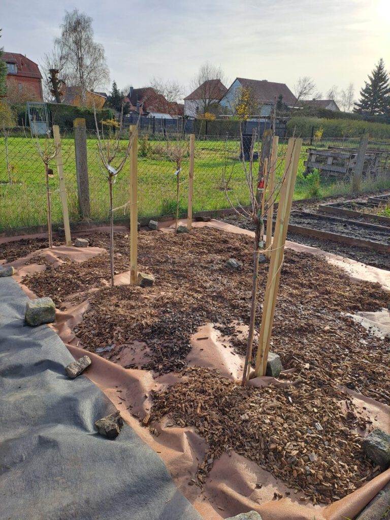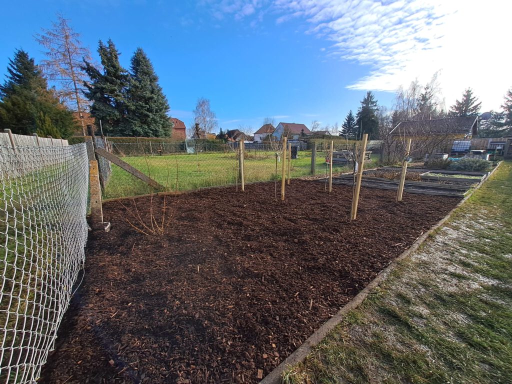 Endlich war alles vorbereitet und wir konnten 1 rote Stachelbeere, 1 Jostabeere, 4 verschiedene Johannisbeeren und die beiden Himbeeren pflanzen.